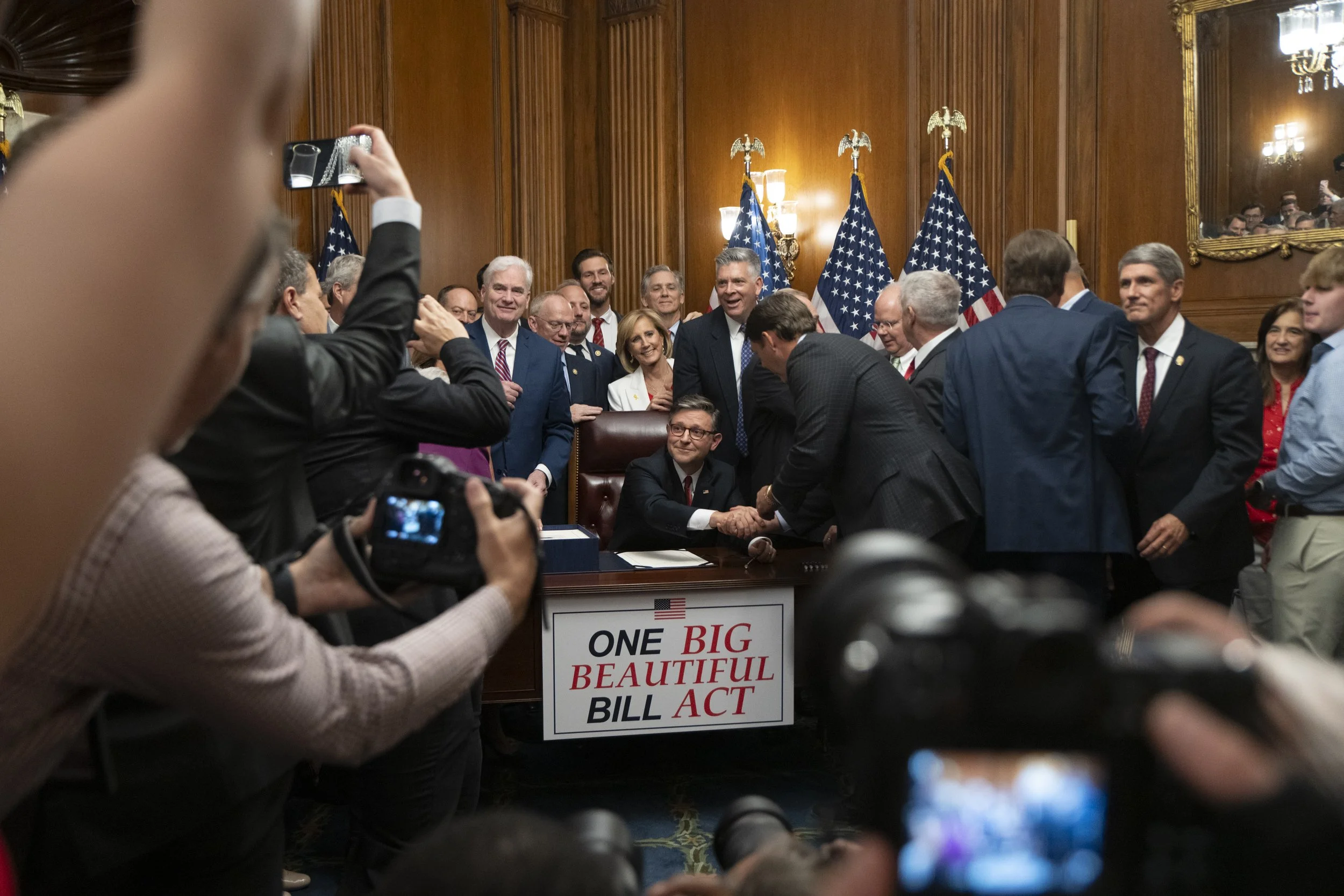 Speaker of the US House of Representatives Mike Johnson (Republican of Louisiana) shakes the hands of republican collegues in teh House of Representatives, after signing the One, Big, Beautiful Bill Act